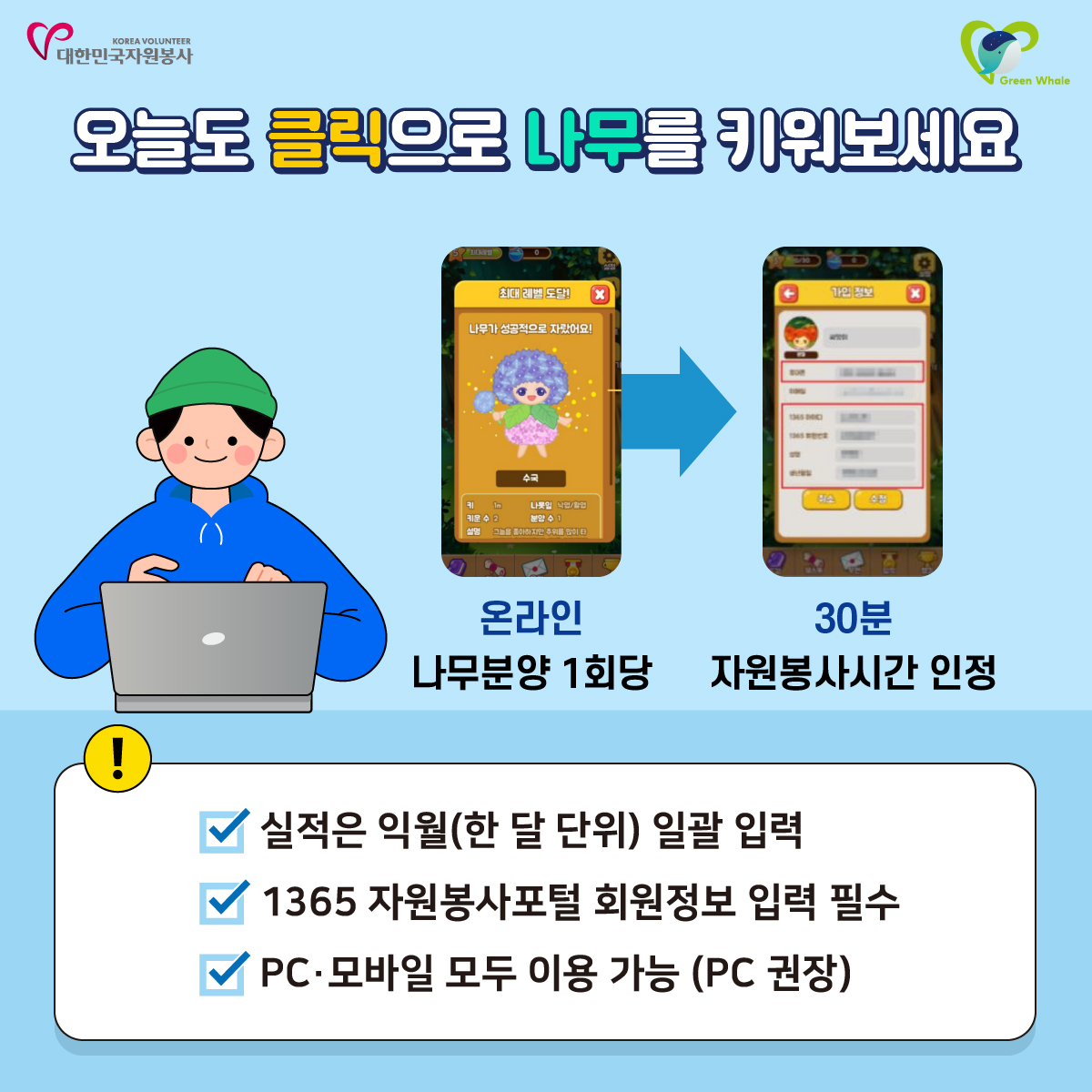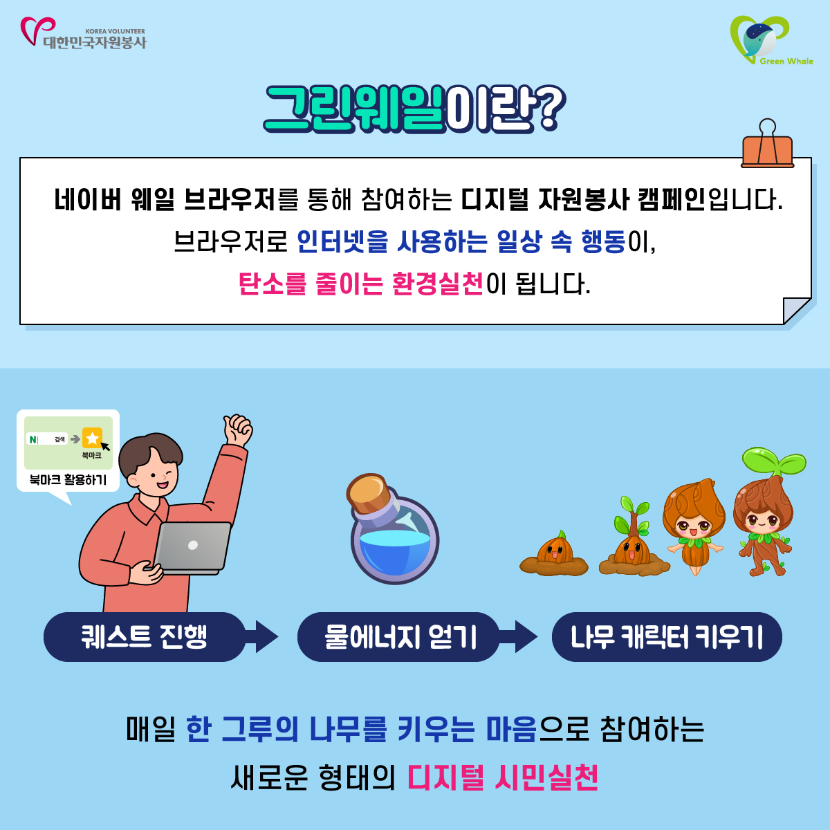 또한 그린웨일은 단순한 온라인 자원봉사를 넘어, 청소년들이 디지털 시대의 환경문제를 이해하고 직접 실천해볼 수 있는 교육형 자원봉사 콘텐츠로 활용할 수 있습니다.